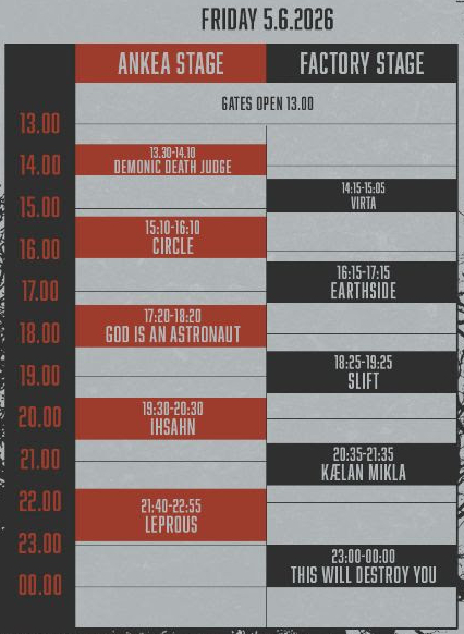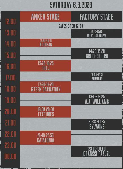 Tampereella järjestetään tulevana kesänä ensimmäistä laatuaan oleva Ankea-festivaalin, joka on erikoistunut vaihtoehtoiseen rockiin ja progressiiviseen metalliin. Kovia ennakko-odotuksia herättäneen kaksipäiväisen tapahtuman soittoaikataulut on nyt julkistettu ja niihin voit tutustua tarkemmin alempaa.